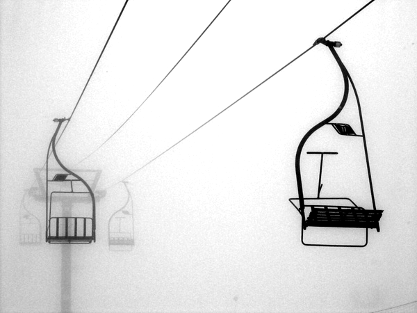 Their ski lift hangs motionless except to creak as they squirm to peer through fog. A female voice, coming from beside Karen makes her jump. “Almost ready. Keep wiggling your toes, young lady. Get those hands off the rail and into your pockets. You’ll need to run and scramble shortly. Numbness won’t help. Ditch the snowboard: it’s no good to you. James, your board too: drop it.”