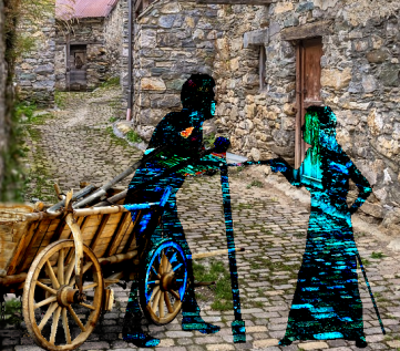 Unlike the children and woman, he’s empty – almost transparent. There’s a dullness, drabness, a lack of life. The woman speeds up a little and hails him, waving one of her sticks. He momentarily pauses in his work but continues without lifting his head.