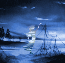 You can’t see the girl at first, just a hard horizon, a promontory and trees silhouetted, a shore and a beach. Look at them for a moment and there she is like a ghost. On one hand she looks calm, her body lost in the routine of hanging nets. But there’s a storm in her– she’s worried. I haven’t worked out why yet. The paint’s pretty dry though.